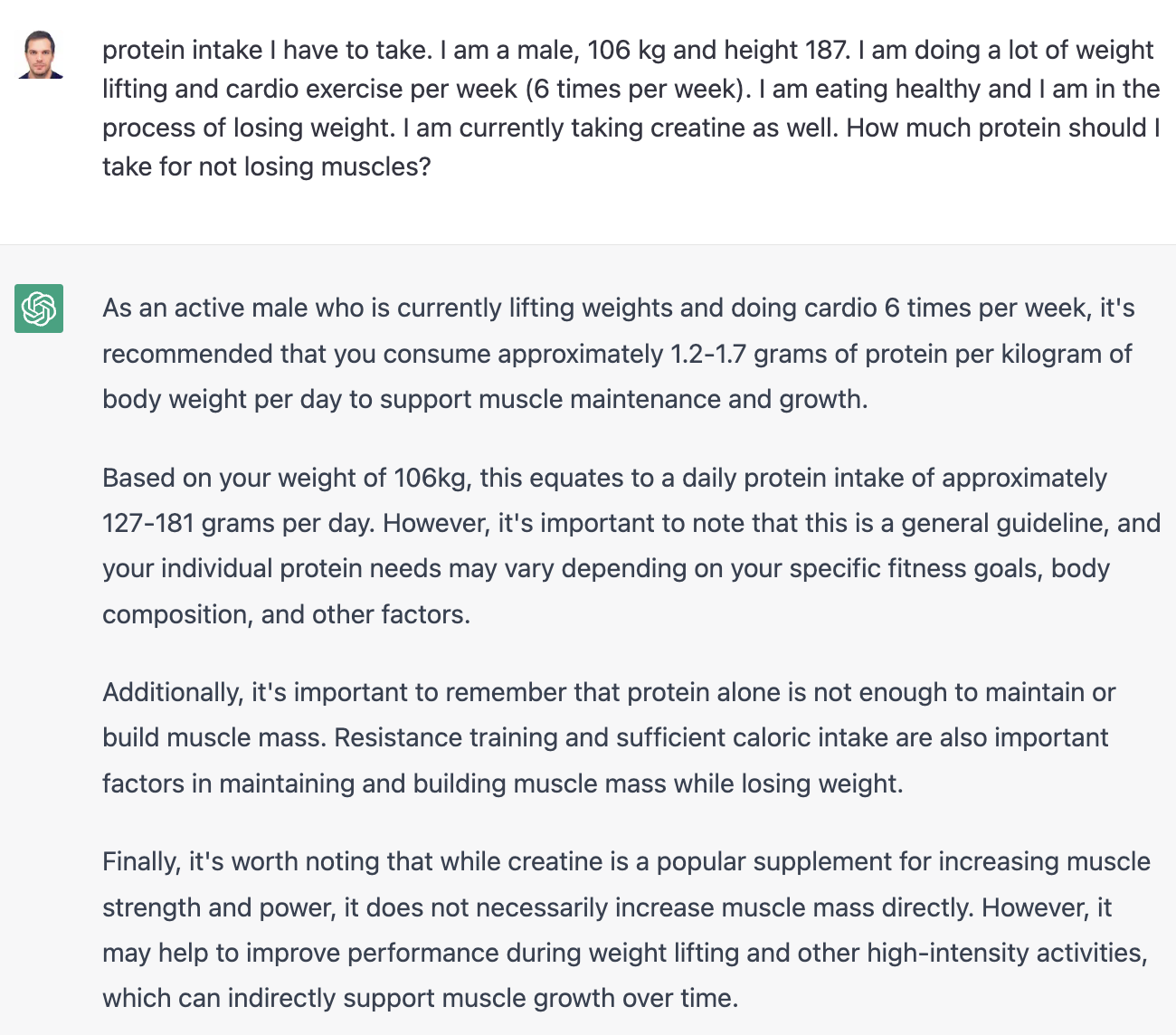 Upon seeking input from friends about the precision of the two responses, they unanimously agreed that GPT-4 provided a superior and more precise answer. Furthermore, GPT-4 remained focused on the query without making extraneous recommendations like "doing resistance training," which I had already mentioned in my question.