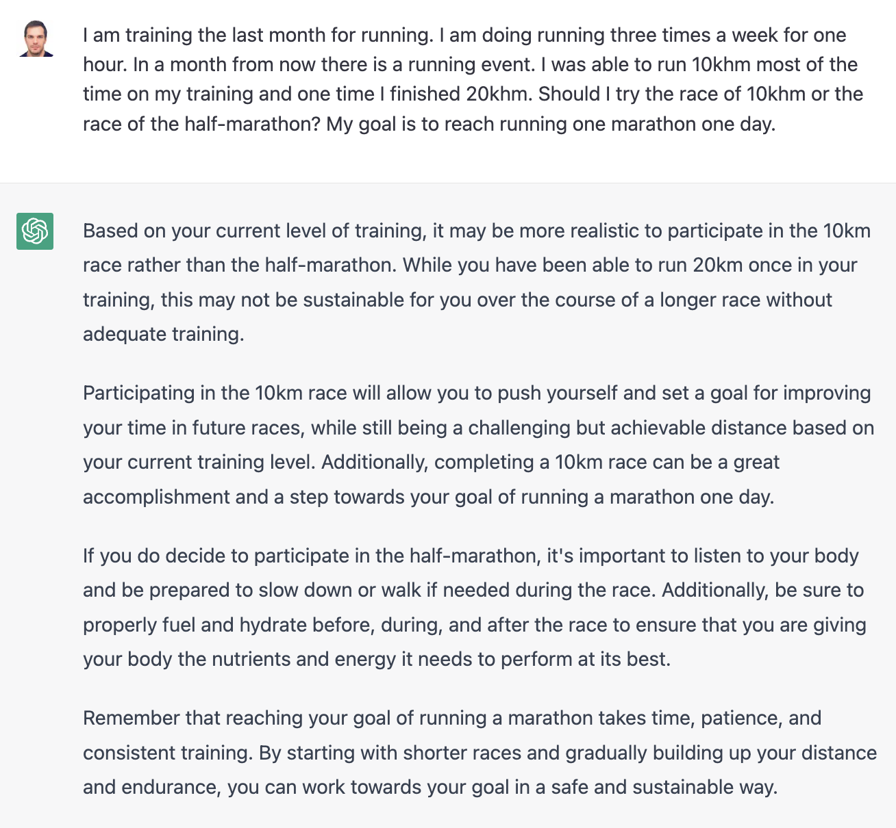For my final question, I asked whether I should participate in a 10km race or a half-marathon. Both versions provided their own distinct answers and approaches for the two options: GPT-3.5 - GPT-4In this case, there was no clear winner, as I found both suggestions to be reasonable. However, I appreciated GPT-4's response for its motivational tone. When consulting my friends, their preferences were divided, with most favoring GPT-3.5's response. Ultimately, I decided to follow GPT-3.5's recommendation and opted for the 10km race, as it would be my first, and I wanted to take things one step at a time.