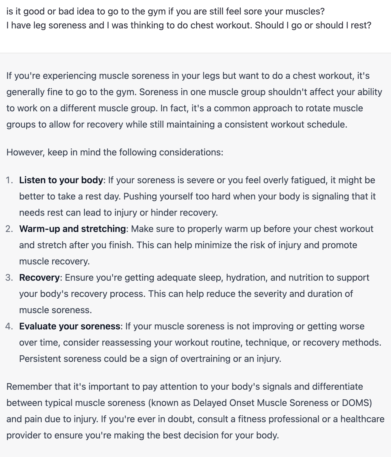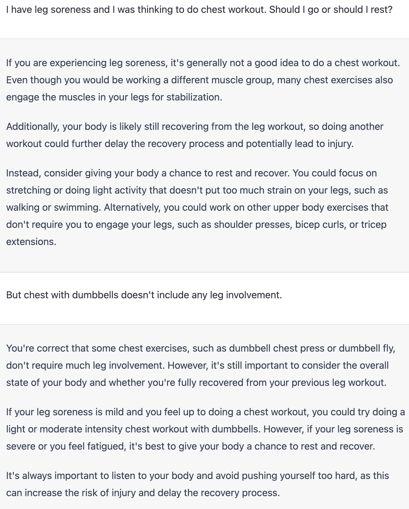My second question was straightforward: I was experiencing severe leg soreness and wondered if I should go to the gym for a chest workout or not. The options were either to go to the gym or to skip it. Intriguingly, each version provided a different recommendation. Here are the exact question and responses: GPT-3.5 - GPT-4I was taken aback, as it was the first time I felt GPT-3.5 had provided an incorrect answer. I conducted the same accuracy assessment with my friends, and we unanimously agreed that GPT-4 offered the correct advice. From a scientific standpoint, GPT-4's response aligns with my understanding as well (though, as a disclaimer, remember that you are reading an engineer's blog post, not a physician's).