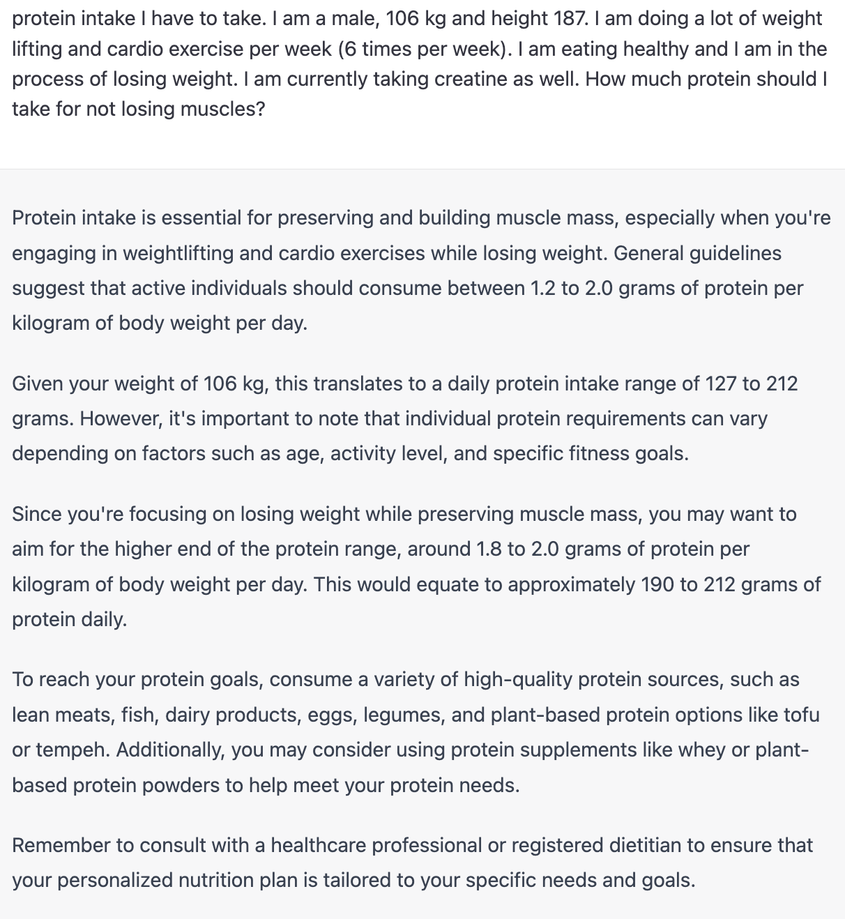 I initially inquired about my daily protein consumption, and I have included the exact question and response here. GPT-3.5 - GPT-4Both answers were backed by scientific evidence, and the recommended protein intake per kg varies slightly. However, upon conducting my own research, I found that GPT-4's suggestion of 1.8-2.0 grams per kg was more accurate. I also observed that GPT-4 consistently includes a disclaimer for such questions, advising users to consult an expert.